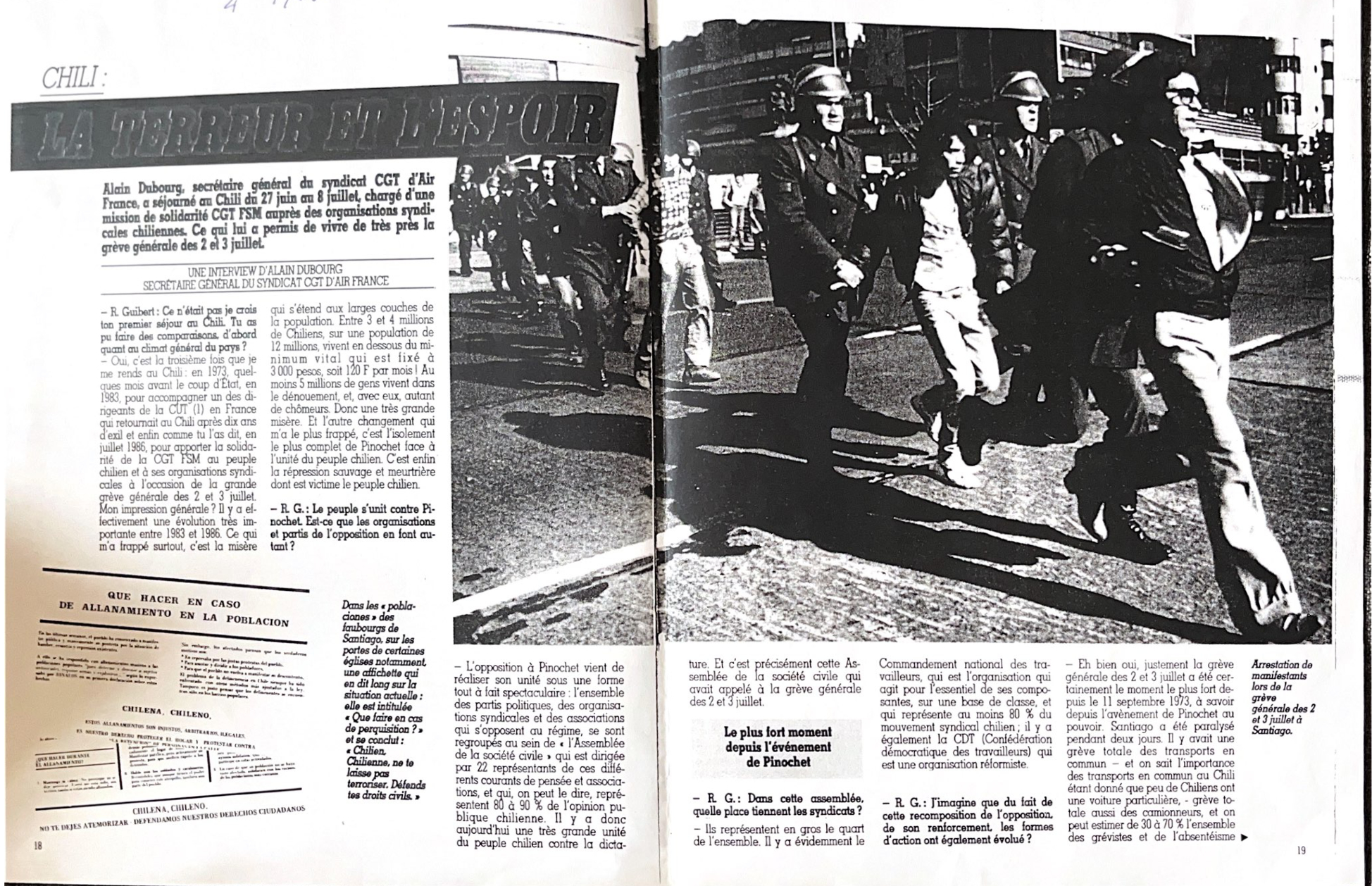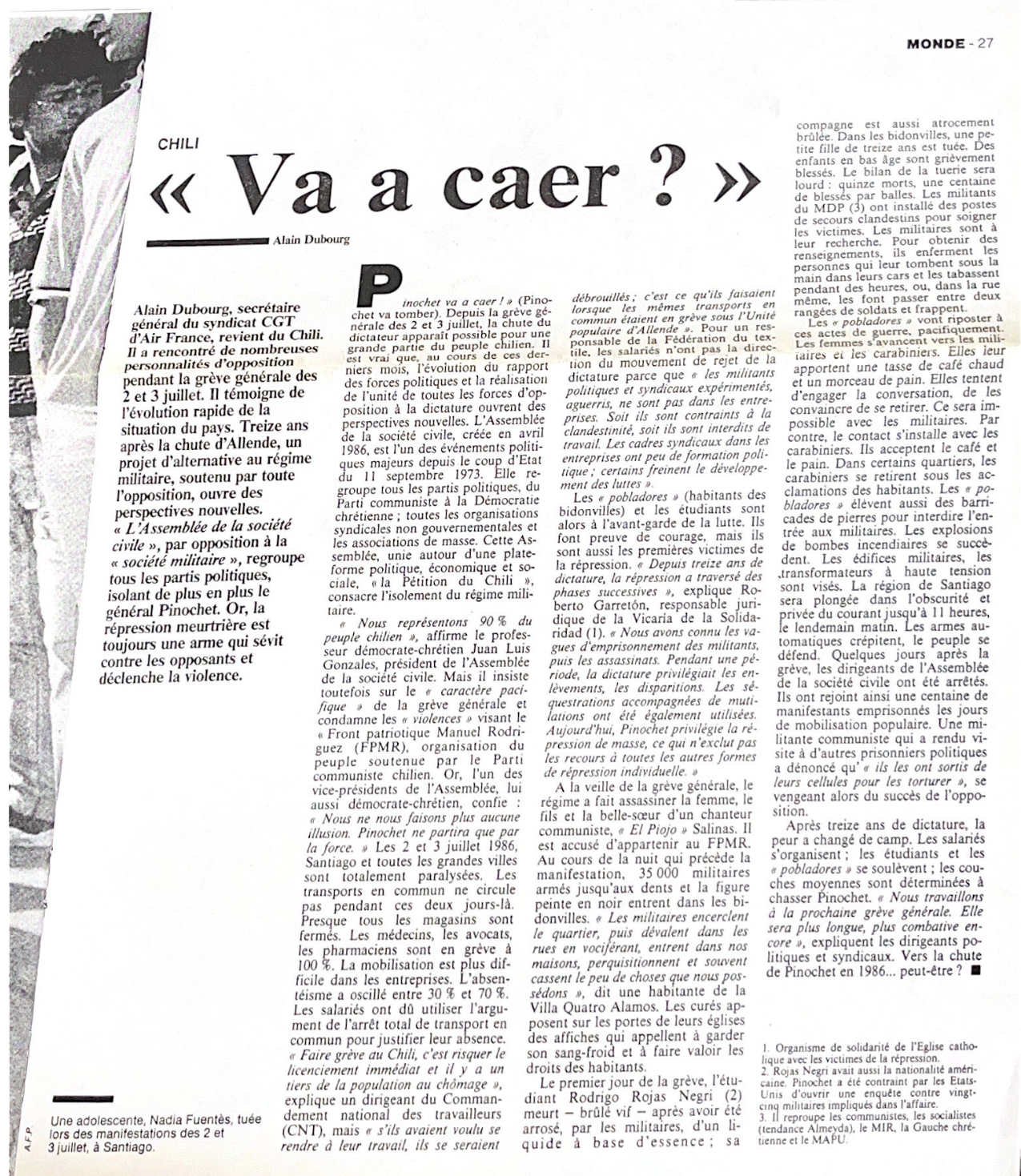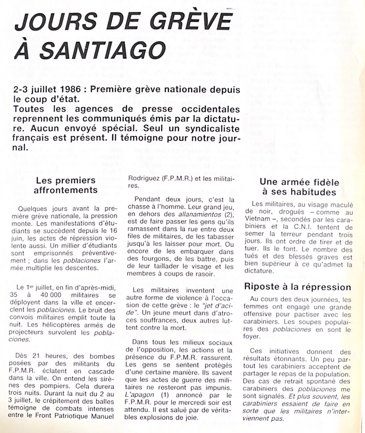 Ce rapport sur les évènements du Chili du début juillet 1986 a été rédigé dans l’avion lors de mon retour en France. Il lui manque certainement un peu de recul et surtout des informations que tu auras lorsque tu le liras. J’ai voulu donner une place à la description de ma propre expérience durant ces 11 jours, car je pense qu’elle peut donner un aperçu de ce qu’est la vie quotidienne, sociale et familiale de nos camarades chiliens qui vivent ce cauchemar depuis 13 ans.